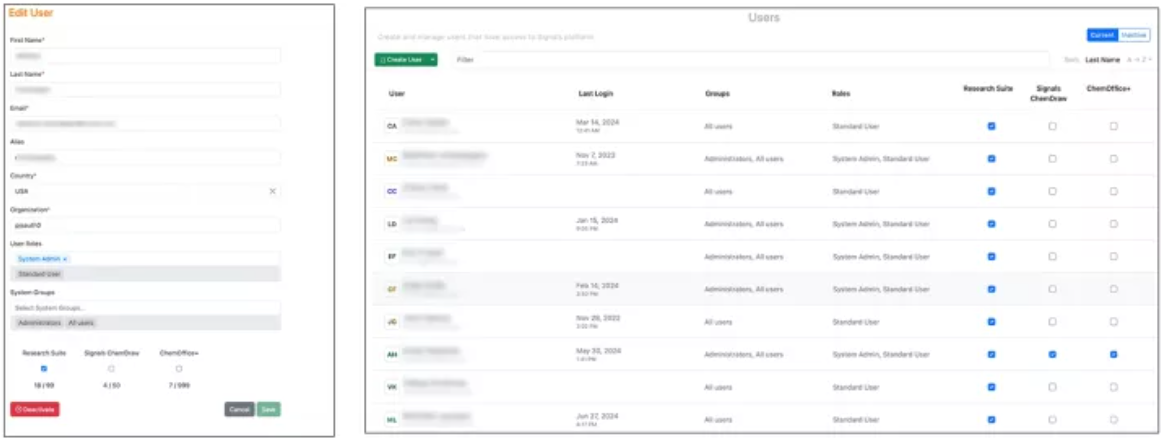 Los administradores deben tener en cuenta que nuestro servicio de licencias actualizado, que anteriormente solo estaba disponible para inquilinos con licencias de Signals Research Suite y/o ChemOffice+, ahora se aplica a todos los inquilinos. Aunque este cambio se está implementando en la misma escala de tiempo aproximada que la versión actual, no implica cambios en el código subyacente y no depende de la versión. Una vez que este cambio se aplica a un inquilino determinado, la asignación de licencias se puede establecer en la página de usuario principal, en las páginas de creación y edición de usuario, así como con la actualización masiva.