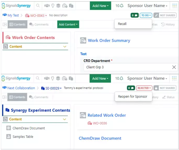 En Synergy, el usuario patrocinador ahora puede recuperar una orden de trabajo que se ha enviado a un CRO, así como reabrir una orden de trabajo rechazada.