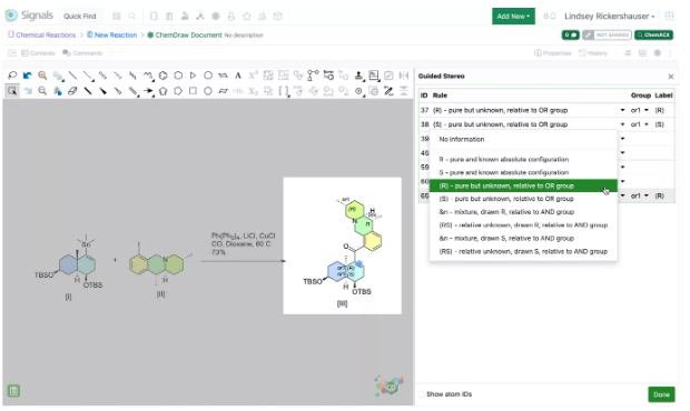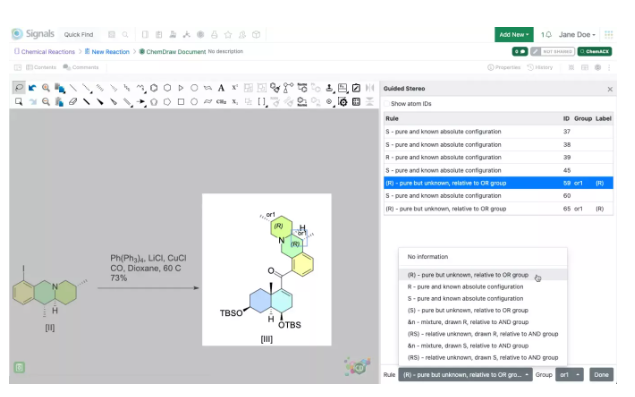 Los químicos ahora pueden ver y anotar la información estereoquímica contenida dentro de su molécula utilizando la herramienta "Anotación estereoscópica mejorada". Esta herramienta permite la asignación de propiedades estéreo mejoradas y la adición de etiquetas químicamente significativas a los estereocentros mediante la aplicación de reglas que describen la composición estereoquímica de cada átomo o enlace. Las etiquetas químicamente significativas se reconocen y respetan en las búsquedas de productos químicos, y si se exportan como un archivo mol, las etiquetas se incluirán en la parte SGROUP del archivo.