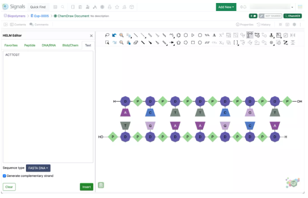 Ahora se pueden generar hebras complementarias de ADN/ARN en ChemDraw a través de la pestaña de texto del editor HELM con los tipos de secuencia FASTA DNA y FASTA RNA. La hebra de la plantilla se insertará en la dirección de 5' a 3' en el lienzo, con el complemento alineado debajo en la dirección de 3' a 5'.