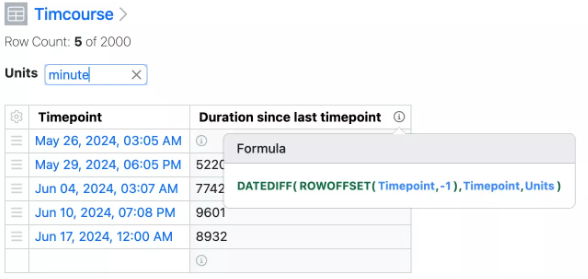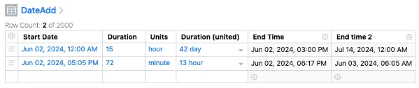 La nueva función DATEDIFF permite calcular una duración entre dos propiedades de fecha y hora. Se utiliza una instrucción como DATEDIFF([Start], [End], "unit"), las unidades admitidas incluyen "Milisegundo", "Segundo", "Minuto", "Hora", "Día" y "Semana". La función se puede configurar en una propiedad Number, alternativamente se puede usar un Number con Unit, con la medida Duration. En tales casos, las unidades no se especifican y el sistema presenta la unidad más lógica.