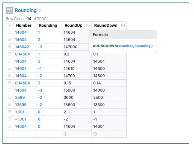 Las funciones ROUNDUP y ROUNDDOWN permiten redondear los números a la unidad más cercana, ya sea hacia arriba (lejos de cero) o hacia abajo (hacia cero). Una instrucción como ROUNDUP([Column], redondeo), en la que la columna es un número y el redondeo es un número entero, redondeará el número a la unidad relevante Un redondeo de 0 redondea a unos, -1 a decenas, -2 a cien, 1 a décimas, 2 a centésimas, etc.