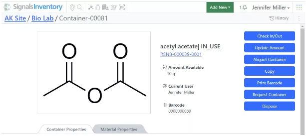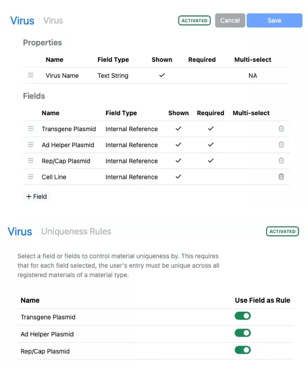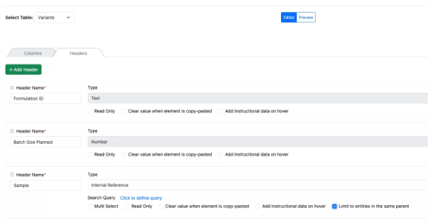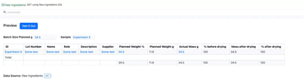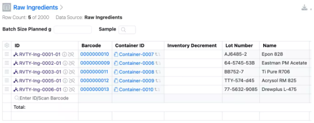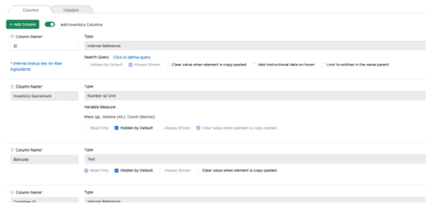 Las tablas definidas por el administrador y las tablas de variación ahora se pueden vincular al inventario si la plantilla de tabla utiliza una fuente de datos interna. El administrador puede optar por agregar columnas de inventario, lo que agrega columnas de código de barras, disminución de inventario y contenedor al ADT o componentes. A continuación, el científico puede introducir un código de barras en la columna ID y el material relacionado se importará a la tabla junto con los datos asociados. El usuario también puede cambiar el contenedor por otro contenedor con el mismo material.