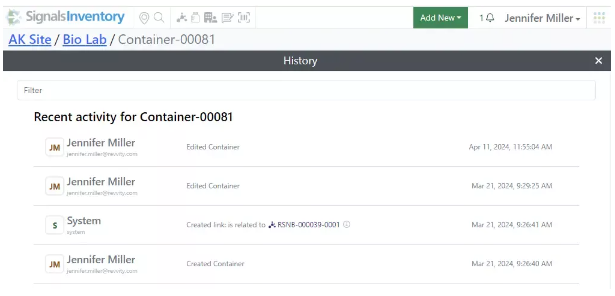 Los usuarios con acceso a los contenedores podrán ver el historial del contenedor haciendo clic en el botón Historial en la esquina superior derecha.