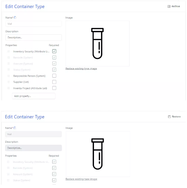 Los administradores ahora pueden archivar una ubicación o un tipo de contenedor. Para archivar una ubicación o un tipo de contenedor, vaya al tipo y abra la vista de detalles.