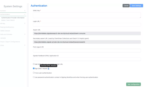 Las organizaciones ahora pueden exigir que durante la autenticación mediante un proveedor de identidad (IdP) externo, la solicitud SAML esté firmada. El administrador puede configurar su flujo de trabajo de autenticación de IdP externo seleccionando la opción "Firmar solicitud SAML", donde también se puede descargar un certificado de Revvity actual para validar la solicitud.Integraciones y APIs
