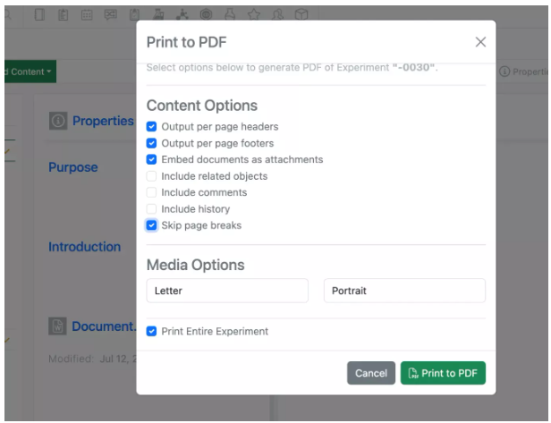 Al imprimir un experimento en PDF, los usuarios ahora tienen la opción de omitir los saltos de página para obtener una vista de informe más corta.