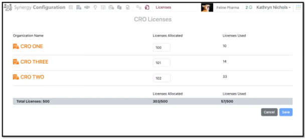 En el aspecto administrativo, los administradores de sistemas y de Synergy (patrocinadores) ahora pueden asignar licencias de CRO de Synergy por CRO. Como resultado, un CRO determinado (u otro socio externo) no puede otorgar licencias a más usuarios de los asignados, lo que permite al Patrocinador reducir la carga administrativa de administrar la rotación de usuarios y las necesidades comerciales dinámicas que a menudo se experimentan al trabajar con socios externos.
