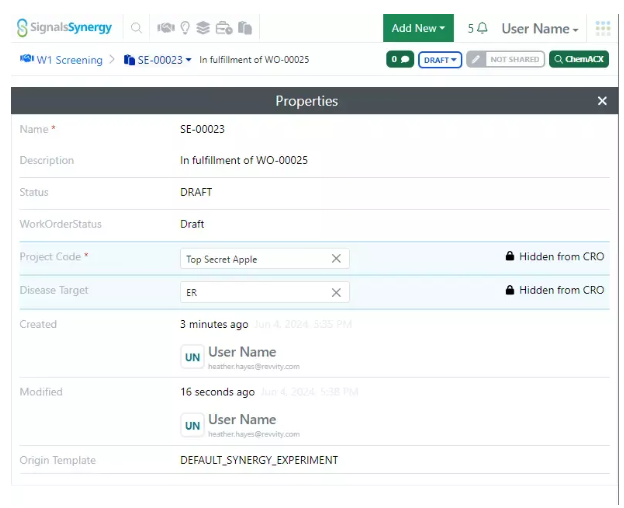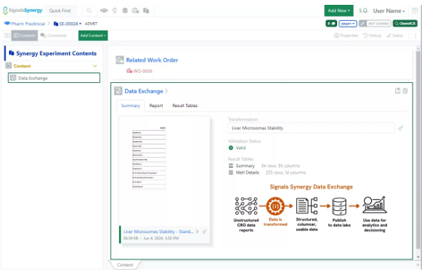 Para cumplir con una orden de trabajo, los experimentos de Synergy permiten a los usuarios de CRO capturar su registro experimental y enviar su trabajo al patrocinador para su revisión. Los experimentos de Synergy son muy similares a los experimentos existentes, ya que admiten contenido como texto, dibujos químicos, Word, Excel, Powerpoint, muestras, tablas, secuencia biológica, imagen, archivo Spotfire, hojas de trabajo y carga de archivos, pero proporcionan flujos de trabajo dedicados para los usuarios patrocinadores y los usuarios de CRO, así como funciones especializadas de seguridad IP.