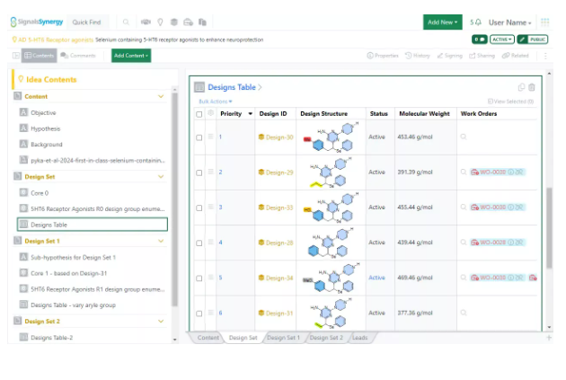 Además, las Ideas y los Diseños son nuevos objetos del sistema para capturar ideas sobre drogas. Las ideas contienen tablas de diseños, que permiten al usuario crear, capturar y priorizar diseños de medicamentos. Las órdenes de trabajo solicitadas para cada diseño también se capturan en el nivel de diseño para realizar un seguimiento.