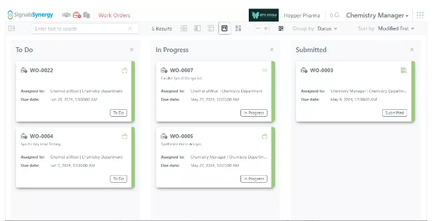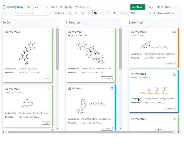 Dentro de la nueva aplicación Synergy, los usuarios de Sponsor pueden gestionar el trabajo colaborativo con sus CRO. En primer lugar, los usuarios pueden solicitar trabajo a un CRO utilizando un nuevo objeto del sistema, las órdenes de trabajo. Las órdenes de trabajo son priorizables, se pueden asignar en grupos a los departamentos de CRO y contienen elementos de contenido tradicionales, como dibujos químicos. Se puede realizar un seguimiento del progreso de las órdenes de trabajo mediante herramientas de gestión de proyectos integradas, como los tableros de órdenes de trabajo de estilo Kanban.