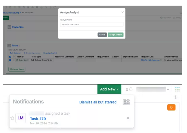 Varias funciones nuevas de tareas, anteriormente en versión beta, ahora están disponibles para todos los sistemas. Los analistas se pueden asignar durante la creación de tareas y desde la tabla de tareas. Las tareas se pueden crear a partir de tablas de materiales. Los analistas tienen una nueva notificación tanto en la aplicación como por correo electrónico para informarles cuando se les asigna una tarea. Los analistas pueden crear un experimento directamente desde una tabla de tareas.