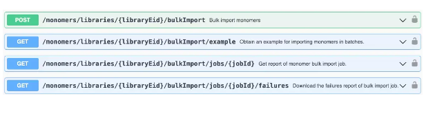 Además, un ejemplo de un archivo de .json bien formado para importar está disponible a través del punto de conexión GET /monomers/libraries/{libraryEid}/bulkImport/example.