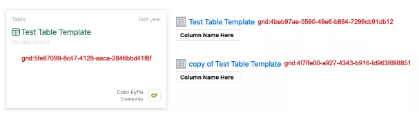 El objeto "Plantilla de tabla de prueba" muestra el eid de la plantilla del sistema "Plantilla de tabla de prueba" tanto para "systemTemplate" como para "template"