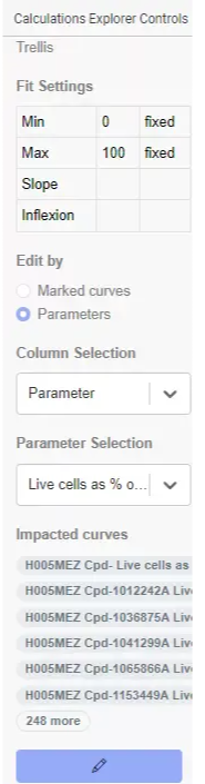 El nuevo análisis multiparamétrico es particularmente importante para analizar simultáneamente los datos de los instrumentos que producen múltiples lecturas (por ejemplo, lectores de placas multimodales o instrumentos de citometría de flujo). La configuración de los ajustes se puede editar, en la pestaña "Administrar ajustes" de los controles del Explorador de cálculos, en función de los nombres (parámetros) incluidos en una columna específica de los datos y se enumeran las curvas afectadas. Además, las plantillas del Explorador de cálculos ahora se pueden guardar en esta nueva modalidad.