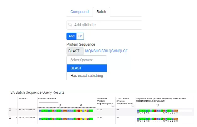 En la aplicación de resumen integrado, los usuarios ahora pueden realizar consultas de secuencias de proteínas y ácidos nucleicos mediante BLAST o coincidencia exacta de subcadenas. Más allá de la salida de consulta estándar, estas búsquedas de biosecuencia también proporcionan resultados de alineación y anotación.