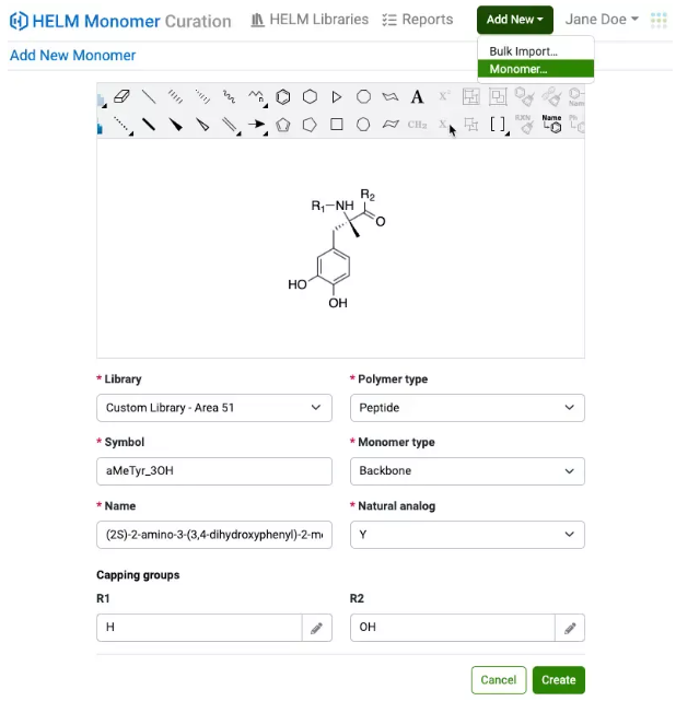 Los usuarios ahora pueden agregar un solo monómero a la vez a una biblioteca de monómeros personalizada en la aplicación HELM Monomer Curation (HMC). Las estructuras de monómeros se pueden dibujar y editar directamente dentro de la aplicación, y todas las propiedades de los monómeros se pueden definir en el formulario 'Agregar nuevo monómero'.