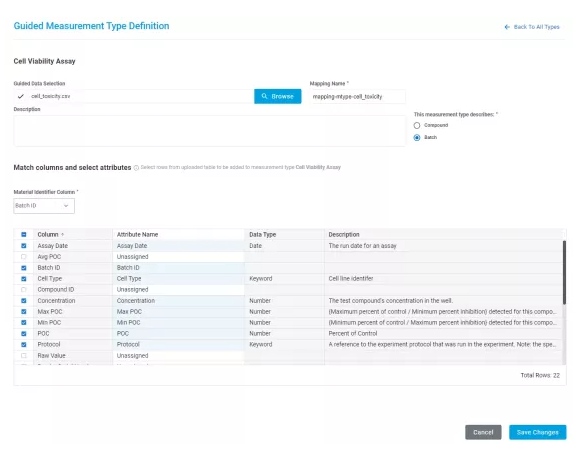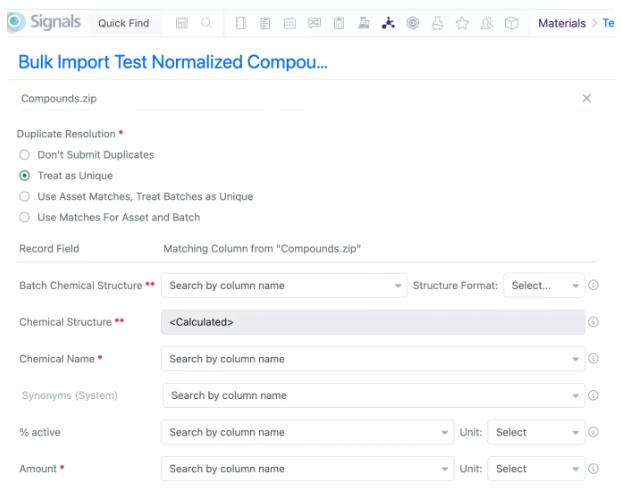 Una vez que se selecciona un archivo, el usuario puede asignar campos para importar y seleccionar las opciones de resolución duplicada. La novedad de esta biblioteca es la opción "Usar coincidencias de activos, tratar lotes como únicos", que permite que los compuestos importados coincidan en función del activo normalizado, pero aún conserven un tipo de lote único para cada lote, y "Usar coincidencias para activos y lotes" realiza una verificación de unicidad en el nivel de activo y lote, lo que permite que los lotes duplicados se registren con el mismo tipo de lote.