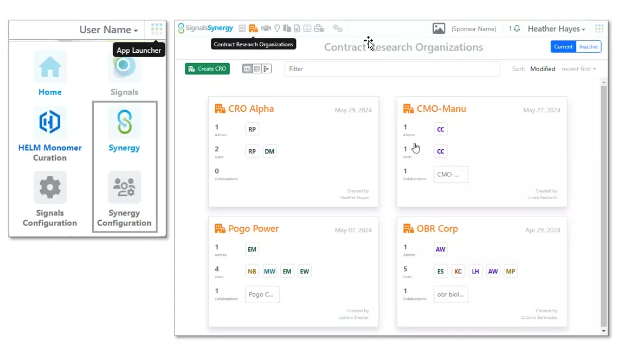 Signals Synergy tiene una aplicación de configuración de Synergy dedicada a la creación de Organizaciones de Investigación por Contrato (CRO) u otros socios contractuales, la creación y concesión de licencias de usuarios de CRO de Synergy y la configuración de entidades relacionadas con Synergy.