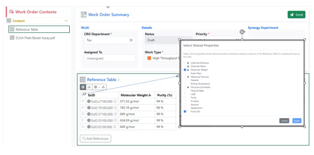 Las órdenes de trabajo también pueden contener tablas de referencia. Las Tablas de Referencia permiten al usuario compartir selectivamente las propiedades de los Materiales o Diseños necesarios para el trabajo solicitado. Las tablas de referencia permiten al usuario enmascarar automáticamente los ID de material mediante ExID y seleccionar solo un subconjunto de propiedades de material para que la CRO las vea.