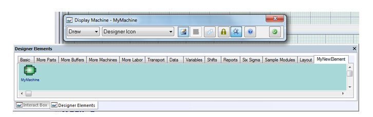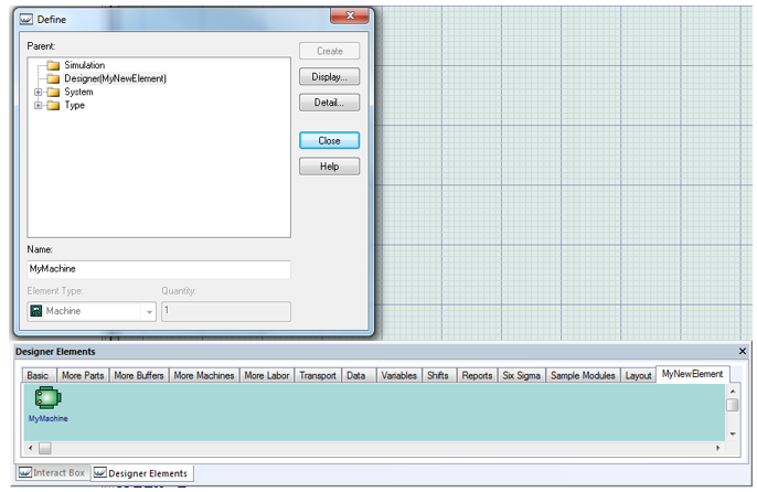 Supongamos que desea crear un elemento de plantilla de máquina. En la lista desplegable, seleccione "Machine" y escriba el nombre del nuevo elemento. Haga clic en el botón etiquetado Create que creará automáticamente el nuevo elemento y lo colocará en la pestaña "MyNewElement".