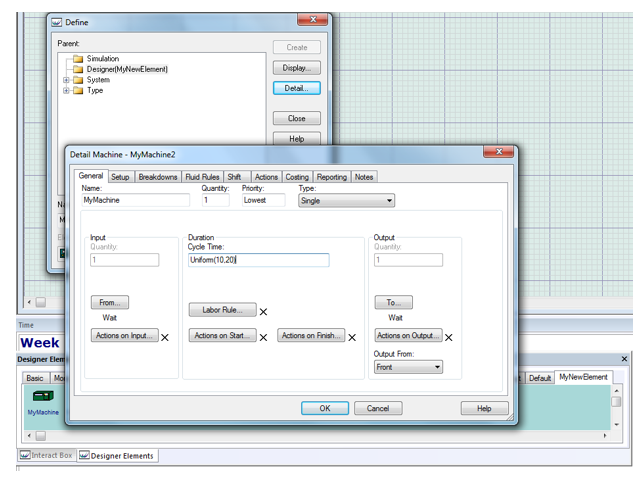 Para detallar la visualización del elemento, seleccione "Detail" en el cuadro de diálogo. Esta acción abrirá el cuadro de diálogo de detalles de la máquina. Supongamos que la plantilla de la máquina tendrá un tiempo de ciclo muestreado de una distribución UNIFORME (UNIFORM). Escriba esta información en el campo correspondiente y confirme la entrada.