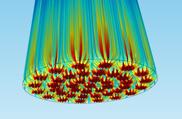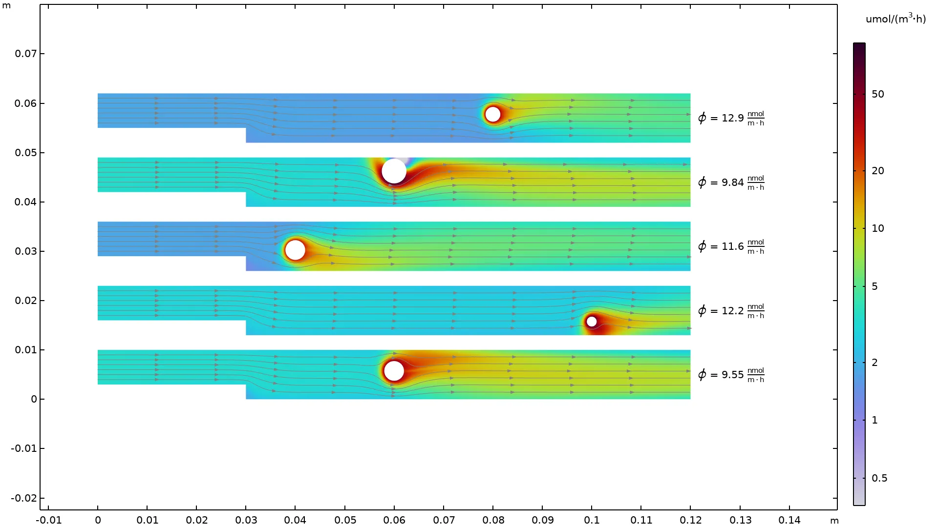 Una célula de flujo en un biosensor contiene un array de micropilares, y las superficies cóncavas de los pilares son recubiertas con un material activo que adsorbe selectivamente biomoléculas en la corriente de la muestra. Esta aplicación permite que el usuario cambie el diseño del sensor alterando parámetros de entrada como el diámetro del pilar, el espaciado de la rejilla y la velocidad de entrada para ver cómo afectan a los resultados de detección.