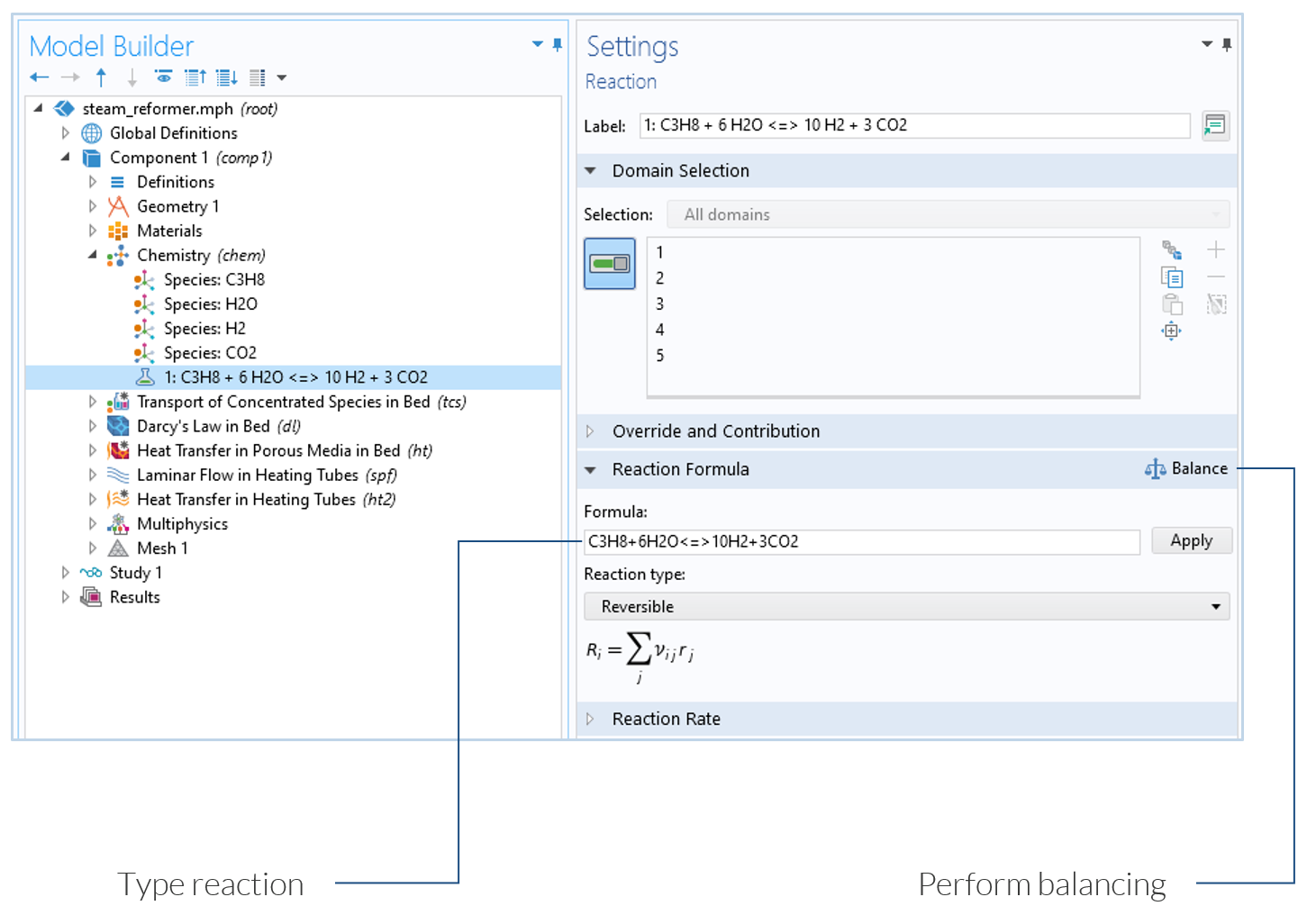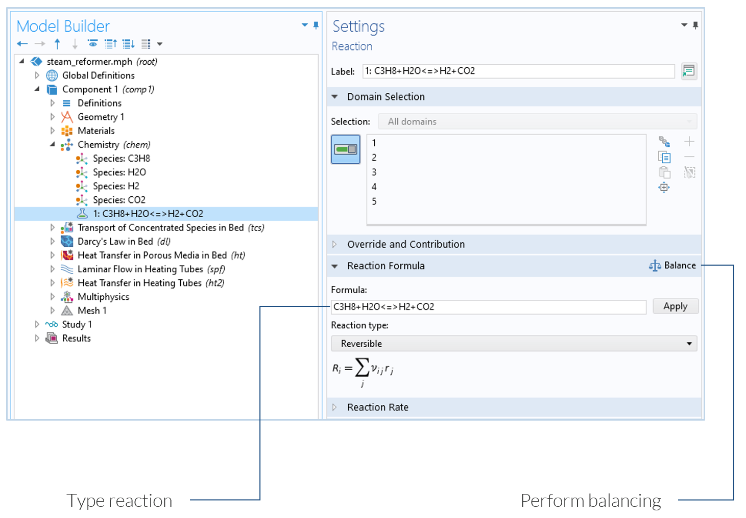 Con COMSOL Multiphysics versión 5.2, se puede cambiar fácilmente la velocidad de reacción individual de una especie directamente en el nodo de especies de la interfaz Reaction Engineering. La expresión introducida anula la definición de velocidad configurada por la funcionalidad Reaction, que por defecto sigue la ley de acción de la masa. En versiones anteriores del programa se editaban las velocidades de reacción de las especies en la vista de ecuación, que podría requerir fuentes adicionales para su compensación.