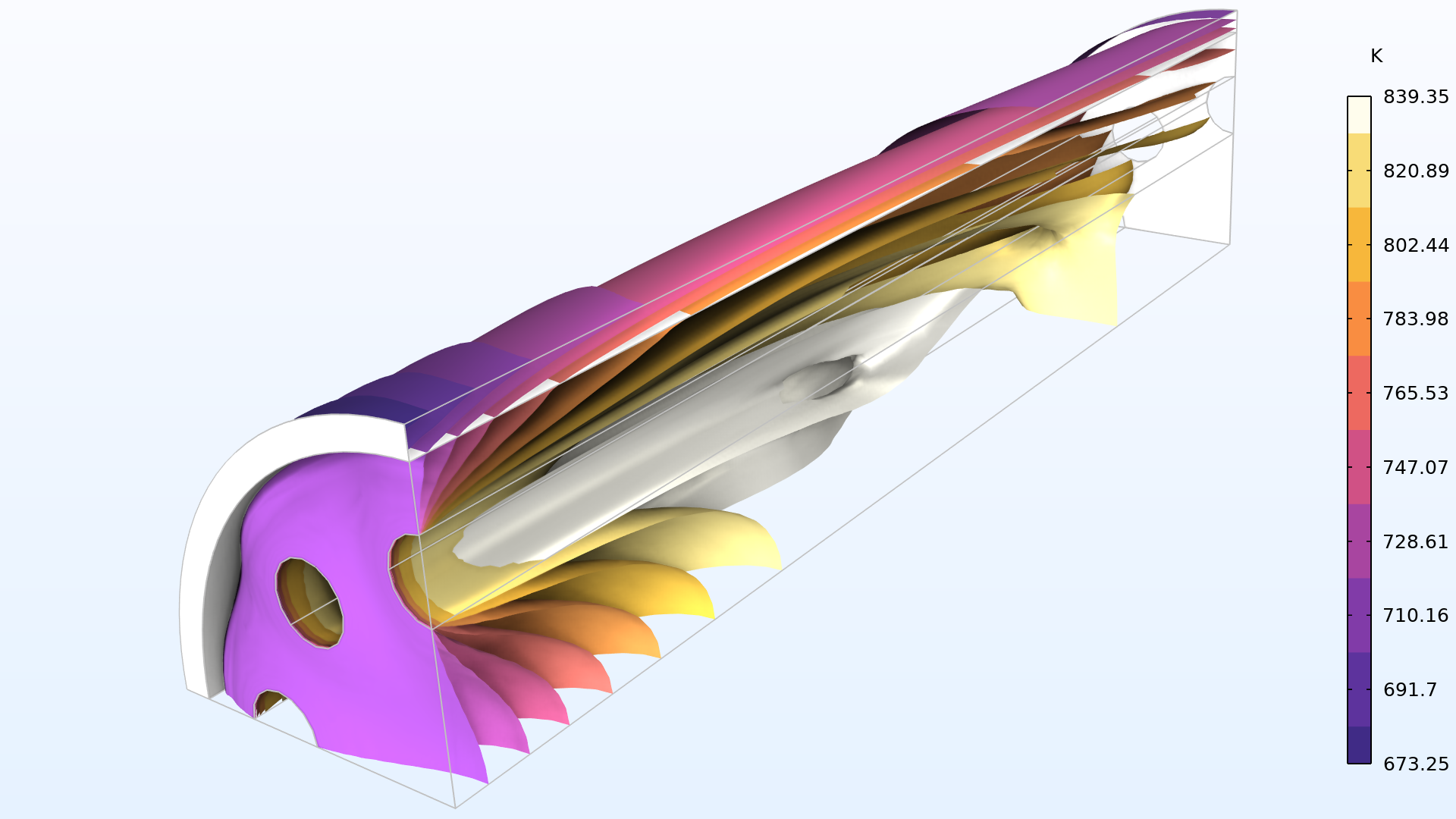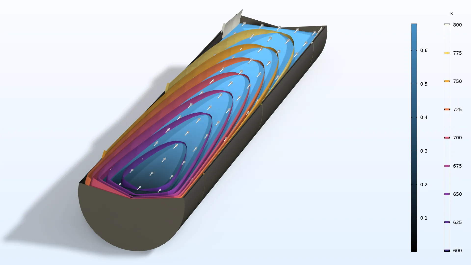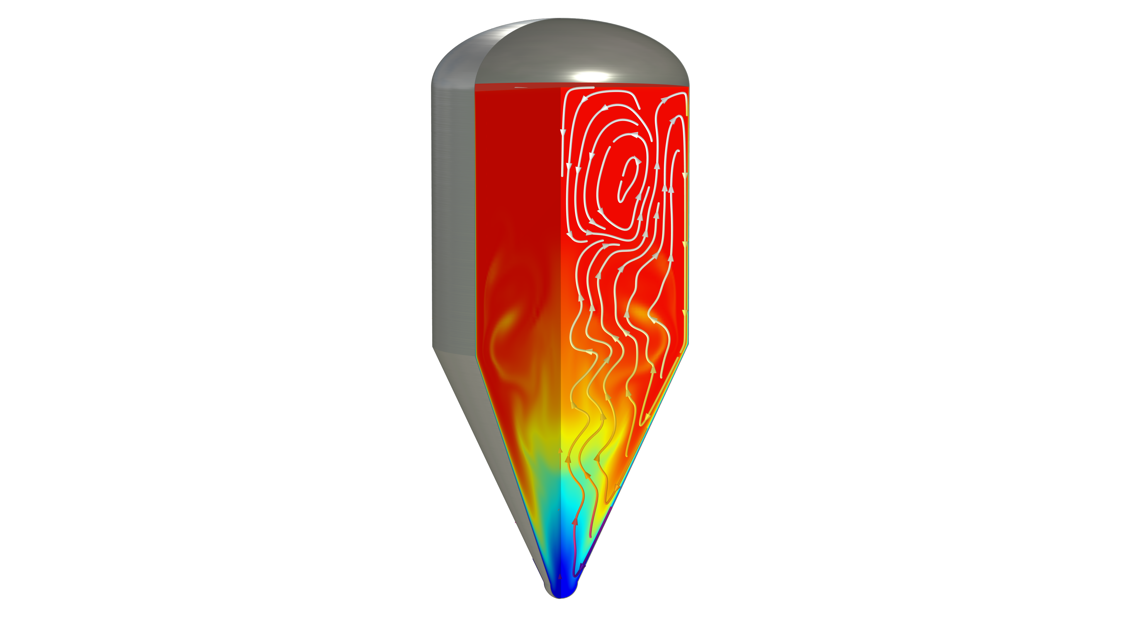 La función Reacting Flow ahora es compatible con LES y aporta una precisión sin precedentes al modelado de sistemas reactivos turbulentos. Al acoplar LES con las interfaces Chemistry, Chemical Species Transport, y Heat Transfer in Fluids, puede capturar la interacción detallada de la mezcla, la transferencia de calor y las reacciones químicas en gases y líquidos. El enfoque tiene en cuenta el calor de reacción, la difusión de entalpía y los flujos de masa, mientras que el modelado LES basado en residuos mejora las predicciones del transporte de calor y masa. Con propiedades químicas y de fluidos dependientes de la temperatura incluidas, esta funcionalidad proporciona información muy realista sobre los campos de concentración, velocidad de reacción y temperatura. Ya sea que esté estudiando reactores catalíticos o procesos de mezcla complejos, los modelos de flujo reactivo basados en LES ayudan a revelar detalles críticos que los modelos de turbulencia tradicionales pueden pasar por alto. Tenga en cuenta que la funcionalidad LES requiere el Módulo CFD.