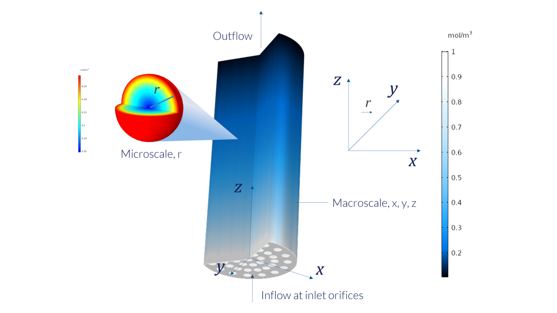 Nuevo Modelo: Un reactor de cama empacada 3D multiescala. Uno de los reactores más común en la industria química, el reactor de cama empacada, es utilizado tanto en síntesis como en tratamiento de efluentes y combustión catalítica. Este modelo analiza la distribución de concentración en el gas reactor que fluye alrededor de los pellets (macroescala), pero también utiliza una dimensión extra que modela la distribución de concentración dentro de cada pellet catalítico poroso (microescala).