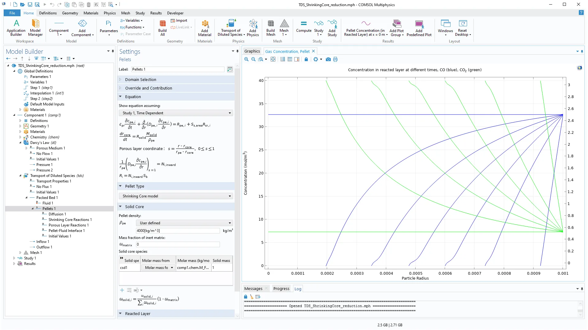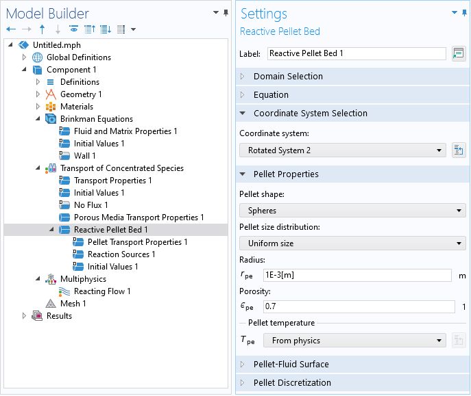 Para facilitar el modelado de reactores de cama empacada, se dispone de una nueva funcionalidad para modelar ecuaciones de transporte y ecuaciones de reacción dentro de pellets, que utiliza la nueva tecnología de núcleo para dimensiones extra. La dimensión extra es configurada para ser 1D. La concentración media en un pellet está disponible para el postprocesado.