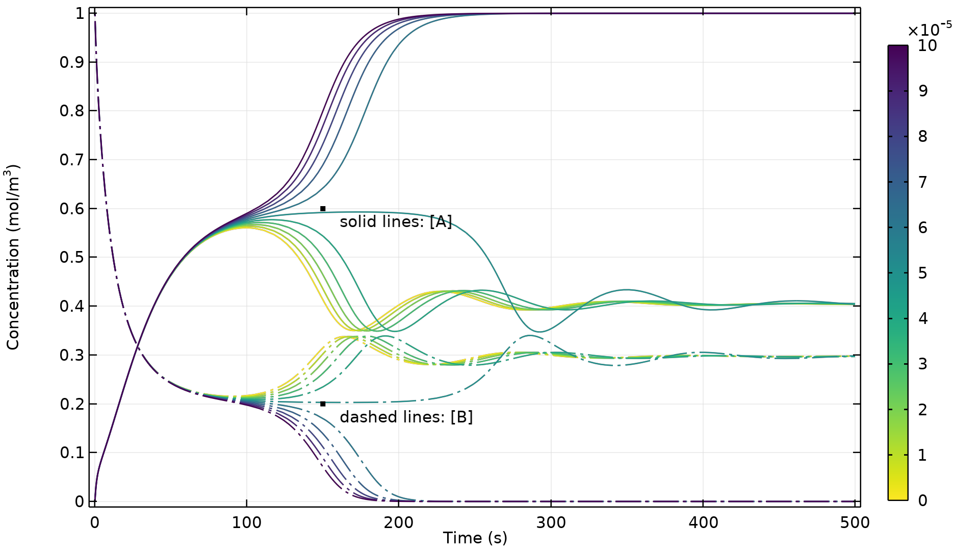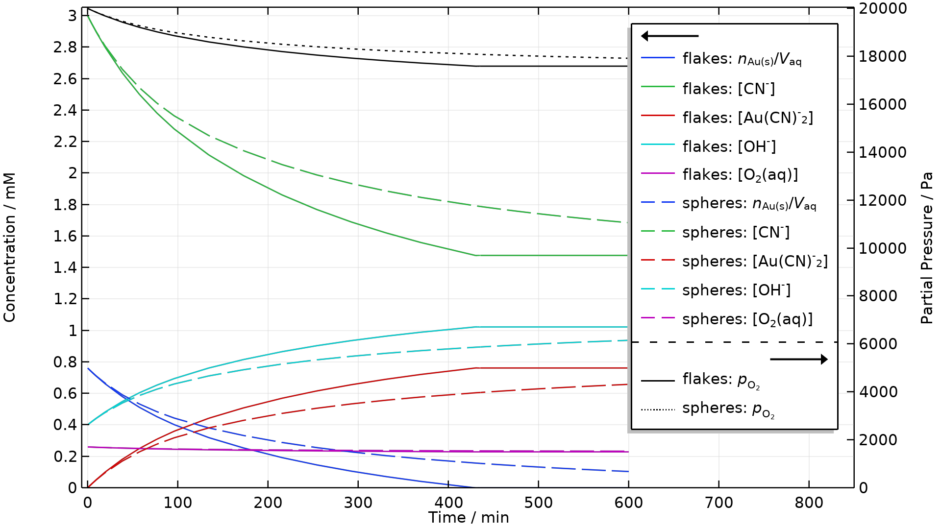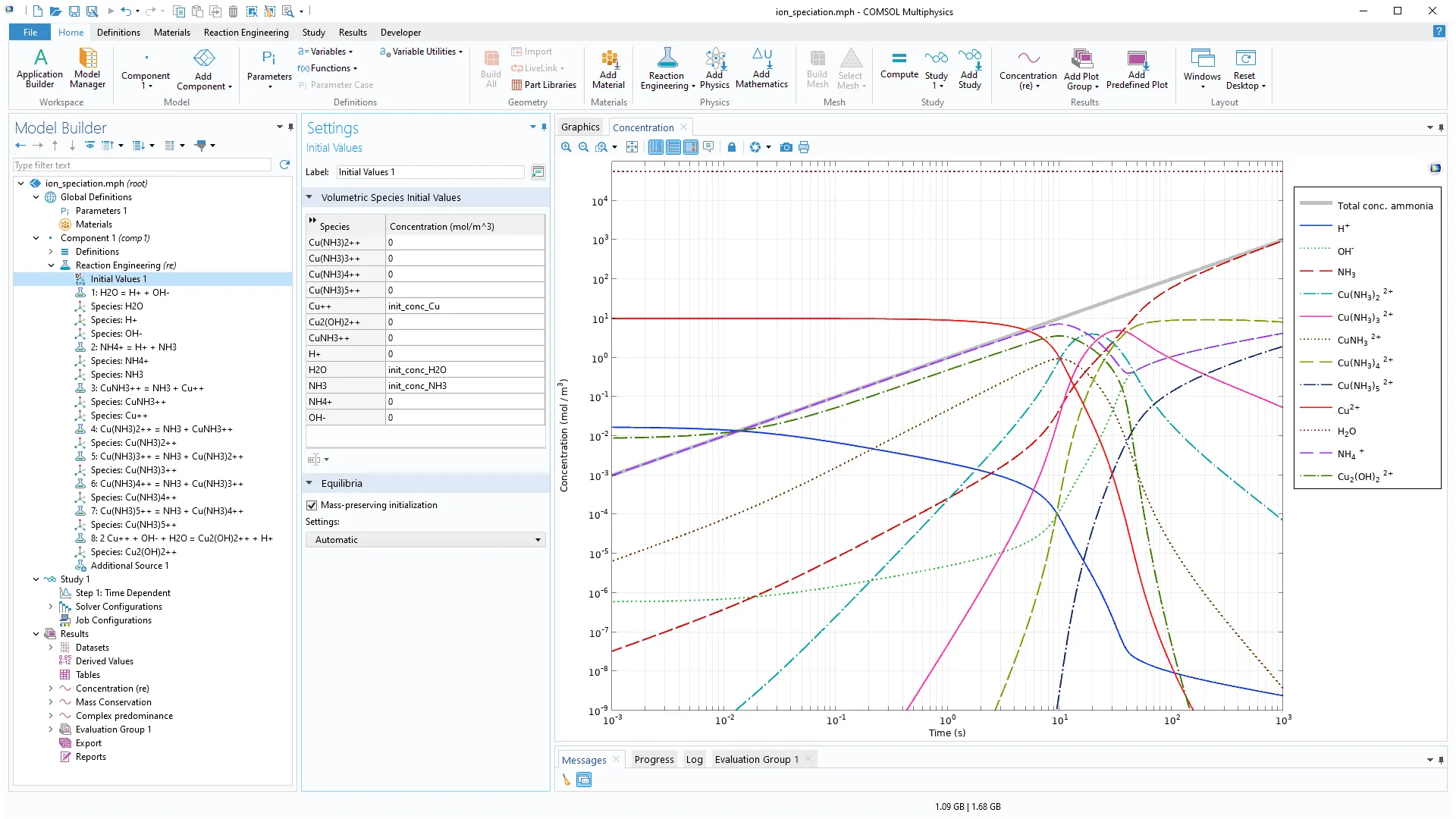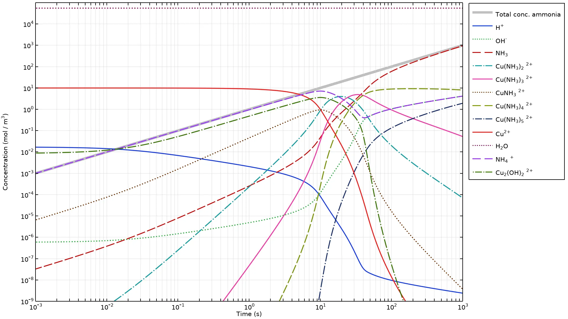 Para reacciones de equilibrio, se puede habilitar una nueva funcionalidad de Mass-preserving initialization en el nodo Initial Values de la interfaz Reaction Engineering, lo que aumenta sustancialmente la precisión y la robustez. Habilitar esta característica facilita la definición de equilibrios químicos sin la necesidad de calcular manualmente un estado inicial. Esto es especialmente útil para mecanismos de reacción complejos donde se supone que varias de las reacciones están en equilibrio. Vease esta adición en el nuevo modelo tutorial Acid-Base Equilibria and Copper Speciation in Ammonia Solution.