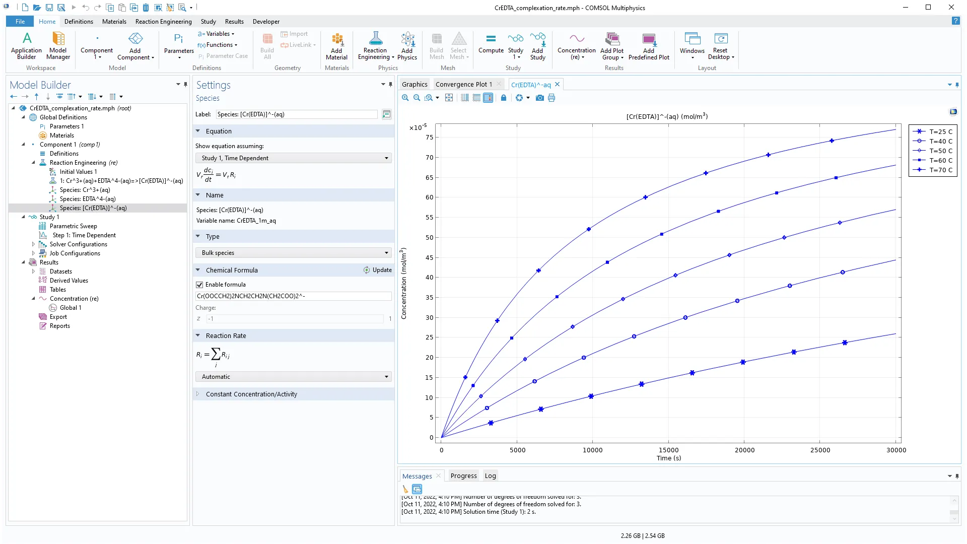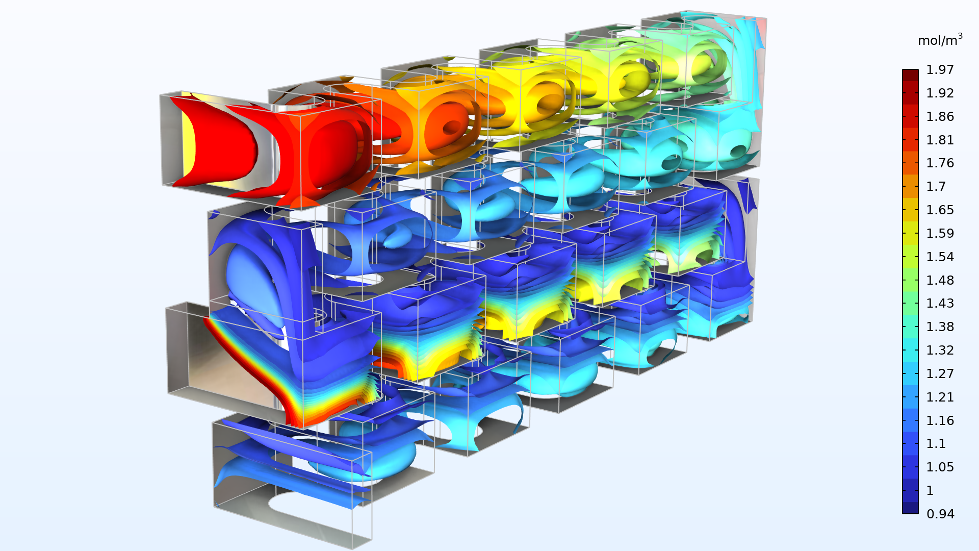 La creación de gráficos útiles y visualmente atractivos de sistemas reactivos puede llevar mucho tiempo, ya que a menudo hay muchos reactivos y, por lo tanto, muchos campos de concentración para representar gráficamente. Para ahorrar tiempo, hay una serie de nuevas plantillas de resultados Result Templates en las interfaces Chemical Species Transport. Entre ellas, ahora hay disponibles plantillas de matriz de gráficos que incluyen hasta cuatro concentraciones de especies simultáneamente en la ventana Graphics. Las plantillas de resultados están disponibles para todas las interfaces de transporte de especies químicas, independientemente del producto complementario, pero son especialmente útiles para las interfaces de transporte multicomponente incluidas en los módulos de ingeniería química, así como en el módulo CFD Module, Porous Media Flow Module, Subsurface Flow Module y Microfluidics Module.