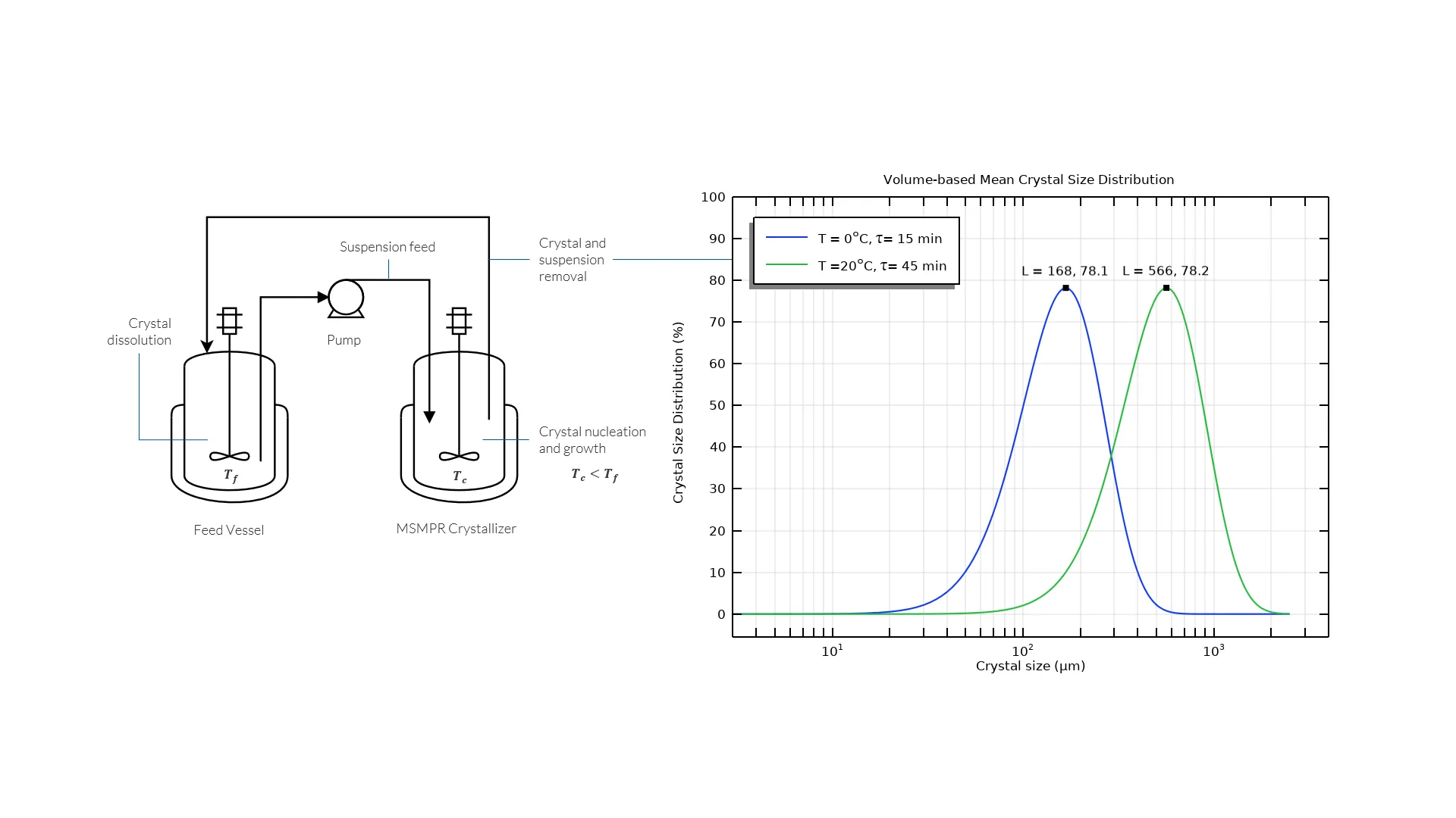 Desde la fabricación farmacéutica hasta el procesamiento avanzado de materiales, modelar con precisión el crecimiento, la morfología y la rotura de partículas es fundamental para la optimización de procesos. La nueva compatibilidad con la agregación y la rotura de partículas permite una simulación realista de la evolución de las distribuciones de tamaño de partícula en los procesos de cristalización, precipitación y granulación. Esta funcionalidad se implementa en la interfaz Precipitation and Crystallization, que ahora resuelve la ecuación de coagulación de Smoluchowski junto con una ecuación de fragmentación para proporcionar una descripción rigurosa de la dinámica de partículas.