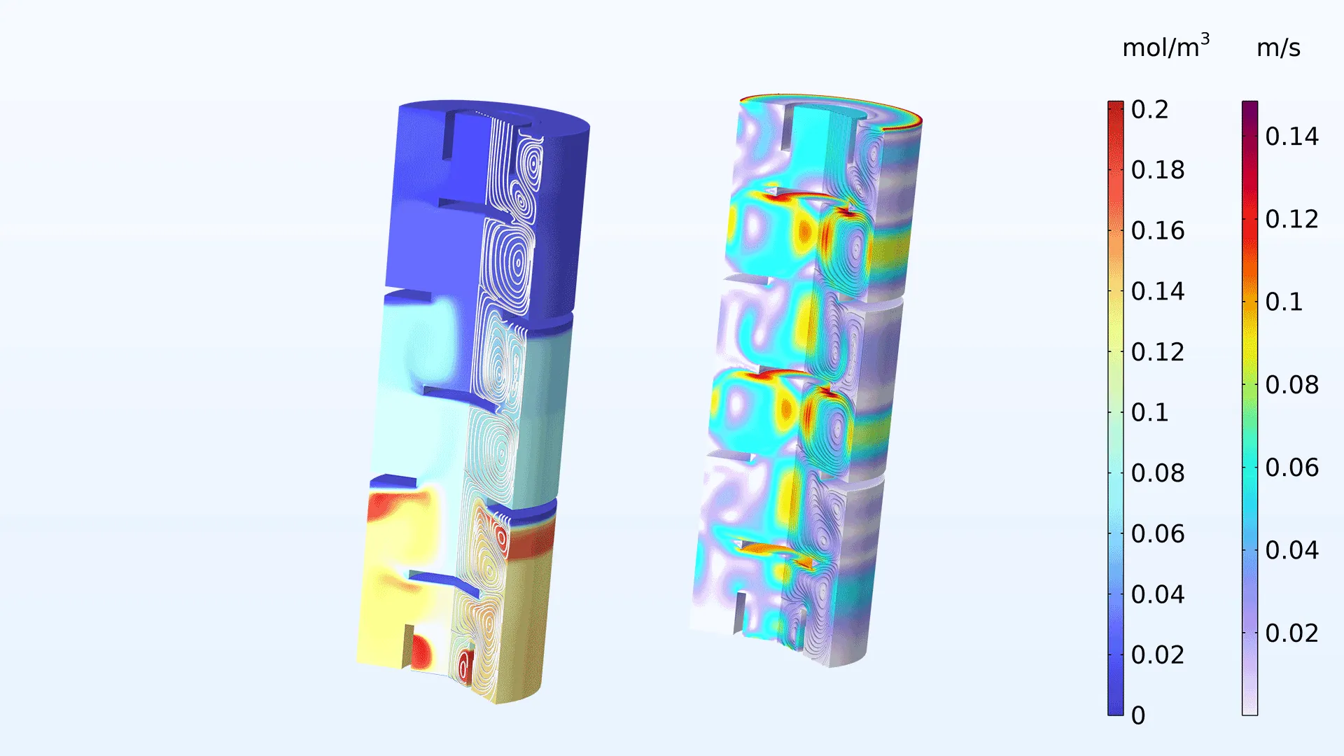 Modelar camas empacadas, reactores monolíticos y otros reactores heterogéneos catalíticos se simplifica sustancialmente con la interfaz de Flujo reactivo en medios porosos. Esta define la difusión, convección, migración y reacción de especies químicas para flujo en medios porosos, sin tener que configurar interfaces separadas y acoplarlas. La interfaz multifísica automáticamente combina todos los acoplamientos e interfaces físicas requeridas para el modelado de catálisis heterogéneas junto con flujo en medios porosos y transporte de especies químicas diluidas o concentradas.
