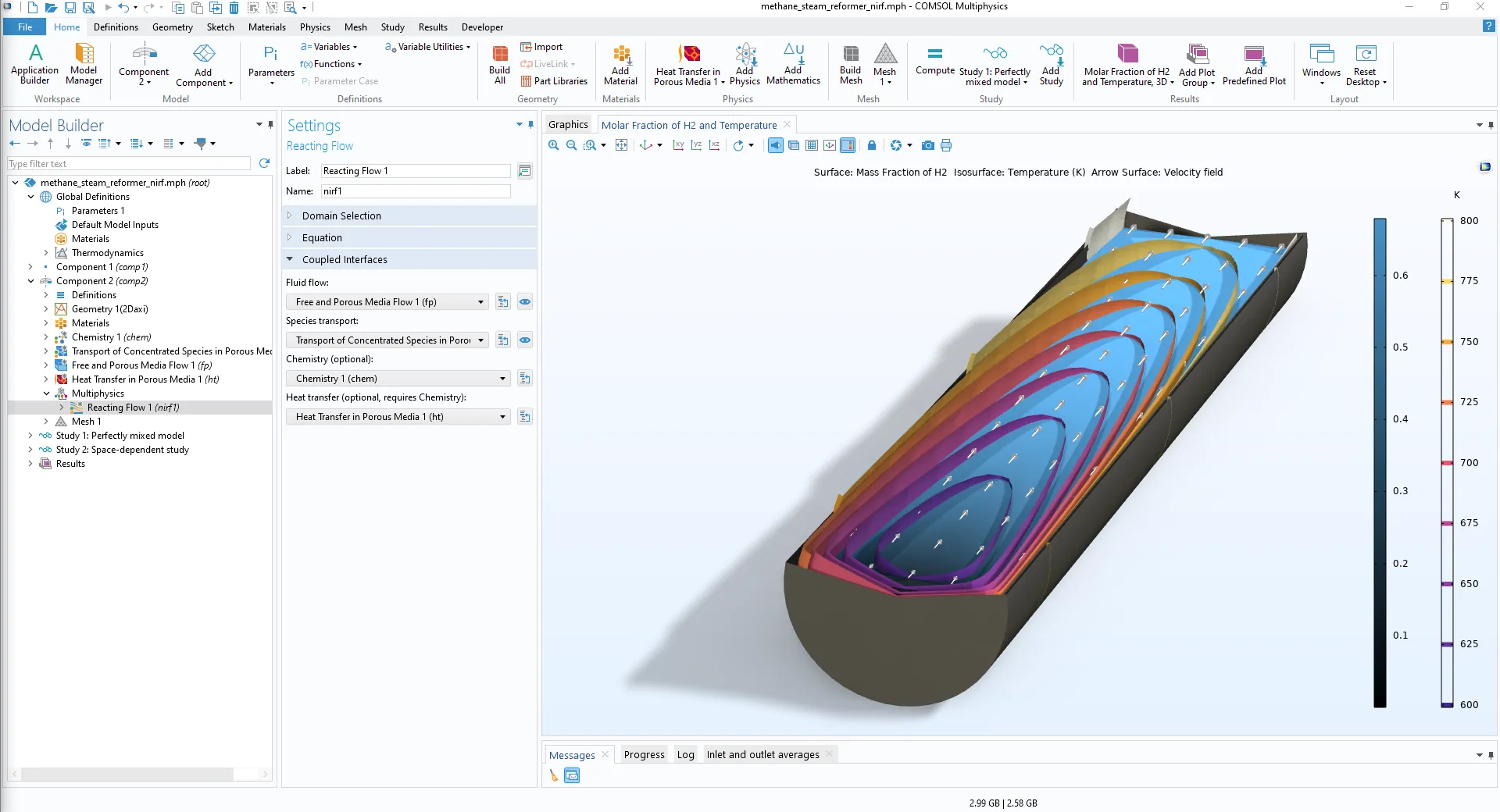 Configuraciones para el acoplamiento multifísico de flujo de reacción no isotérmico aplicado en medios porosos, ejemplificado en un reformador de vapor de metano.
