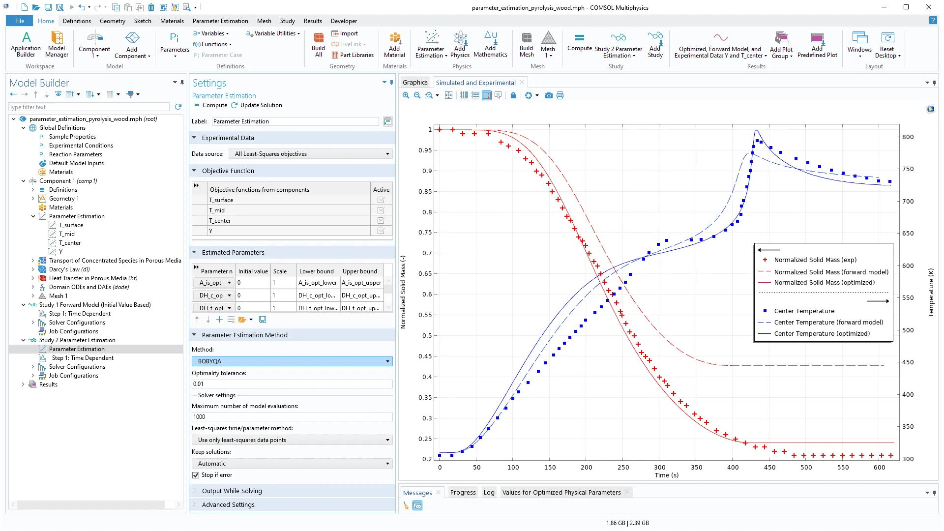El módulo Chemical Reaction Engineering se ha ampliado con nuevas capacidades para la estimación de parámetros que anteriormente requerían el módulo de optimización Optimization Module. Ahora se incluye la funcionalidad para definir múltiples objetivos a partir de datos experimentales, así como una variedad de resolvedores, incluidos los resolvedores IPOPT y Levenberg-Marquardt basados en gradientes y el resolvedor BOBYQA sin gradientes. Puede verse esta funcionalidad en uso dentro del nuevo modelo tutorial Pyrolysis of Wood.