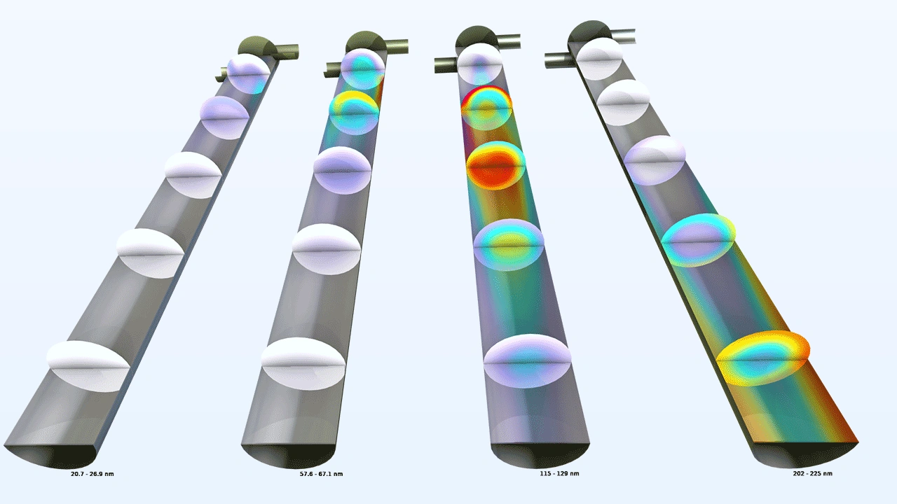 Este ejemplo aplica las interfaces Transporte electroforético y Flujo laminar para modelar separación isoeléctrica en un dispositivo de electroforesis de flujo libre. Una corriente que contiene cuatro proteínas diferentes las separa en corrientes concentradas por medio de transporte migrativo en un campo eléctrico.