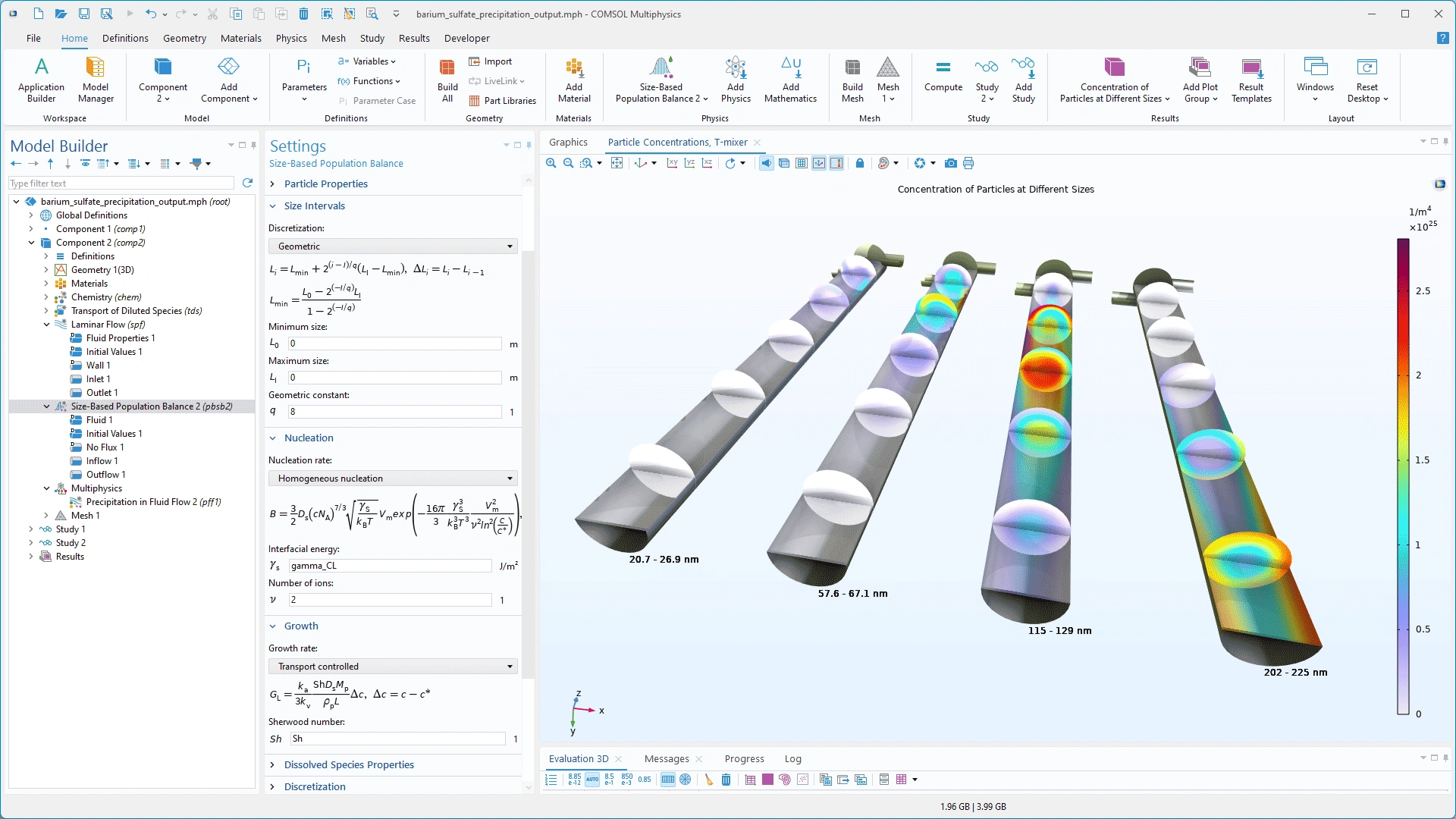 La nueva funcionalidad para modelar los procesos de precipitación y cristalización permite realizar estudios de procesos de separación en áreas como la industria química fina, la industria química a granel y la industria farmacéutica. En geometrías dependientes del espacio, la interfaz Precipitation and Crystallization in Fluid Flow combina la nueva interfaz Size-Based Population Balance con las interfaces Transport of Diluted Species y Laminar Flow. Calcula la distribución de la población en el tiempo y el espacio (es decir, resuelve la densidad numérica de todos los tamaños de partículas) teniendo en cuenta la nucleación de partículas, el crecimiento de partículas y el transporte de fluidos. La interfaz Precipitation and Crystallization in Fluid Flow también se puede utilizar para calcular la distribución de partículas en un modelo de reactor ideal. El modelo tutorial Precipitation of Barium Sulfate muestra esta nueva funcionalidad.