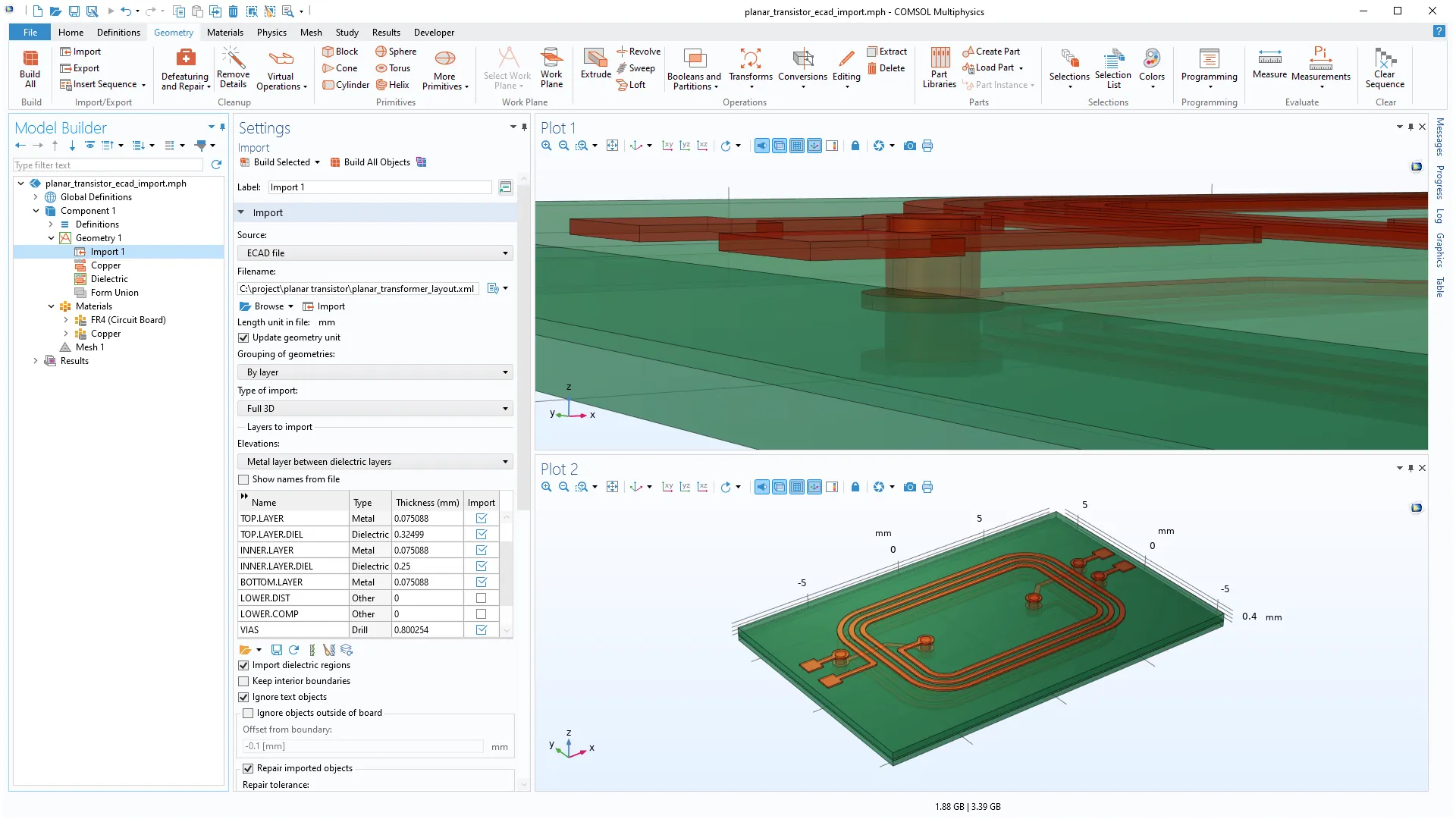 El módulo de importación ECAD aporta una mejora significativa del rendimiento para la importación de capas de cobre desde archivos IPC-2581 y ODB ++. Las capas de cobre grandes pueden importarse varias veces más rápido en comparación con las versiones anteriores de COMSOL Multiphysics®.