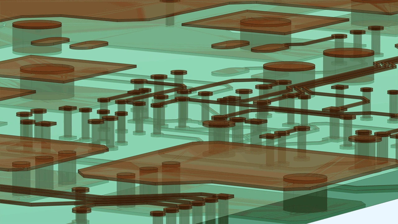 La importación de una PCB con las nuevas opciones predeterminadas da como resultado, en un solo paso, una geometría 3D adecuada para la configuración de la simulación y el mallado de barrido. El espesor de las capas se exagera en la imagen. El archivo ODB++ se proporciona por cortesía de Hypertherm, Inc., Hanover, NH, EE.UU.