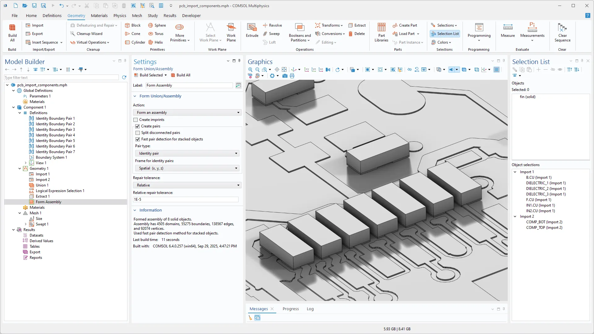 Al importar archivos IPC-2581 y ODB++ a COMSOL Multiphysics® versión 6.3, se pueden generar geometrías de componentes simplificadas en función de los contornos de los componentes en los archivos. Los componentes se pueden representar como caras planas o extruirse utilizando la información de altura del archivo. A estos componentes generados se les asignan atributos automáticamente para una fácil identificación en función de sus nombres y tipos de paquetes. Con las nuevas funciones de selección Logical Expression Selection, los atributos se pueden utilizar en expresiones para crear selecciones.