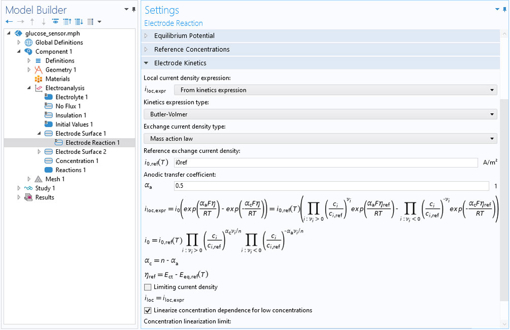 La nueva opción Linealizar... mejora la cinética para órdenes de reacción no unitarias al evitar problemas al evaluar potencias de números negativos. Esta función está disponible en los nodos Reacción en electrodo y Reacción en electrodo poroso en las interfaces de Distribución de corriente terciaria cuando se utiliza la ecuación de Nernst para el potencial de equilibrio en combinación con la Ley de acción de masas o de Múltiples pasos concentrados para la densidad de corriente de intercambio. La nueva opción Linealizar está activada de forma predeterminada al crear un nuevo modelo y es utilizada por todos los modelos tutoriales que presentan la ecuación de Nernst y la ley de acción de masas o las opciones de cinética de varios pasos concentrados.