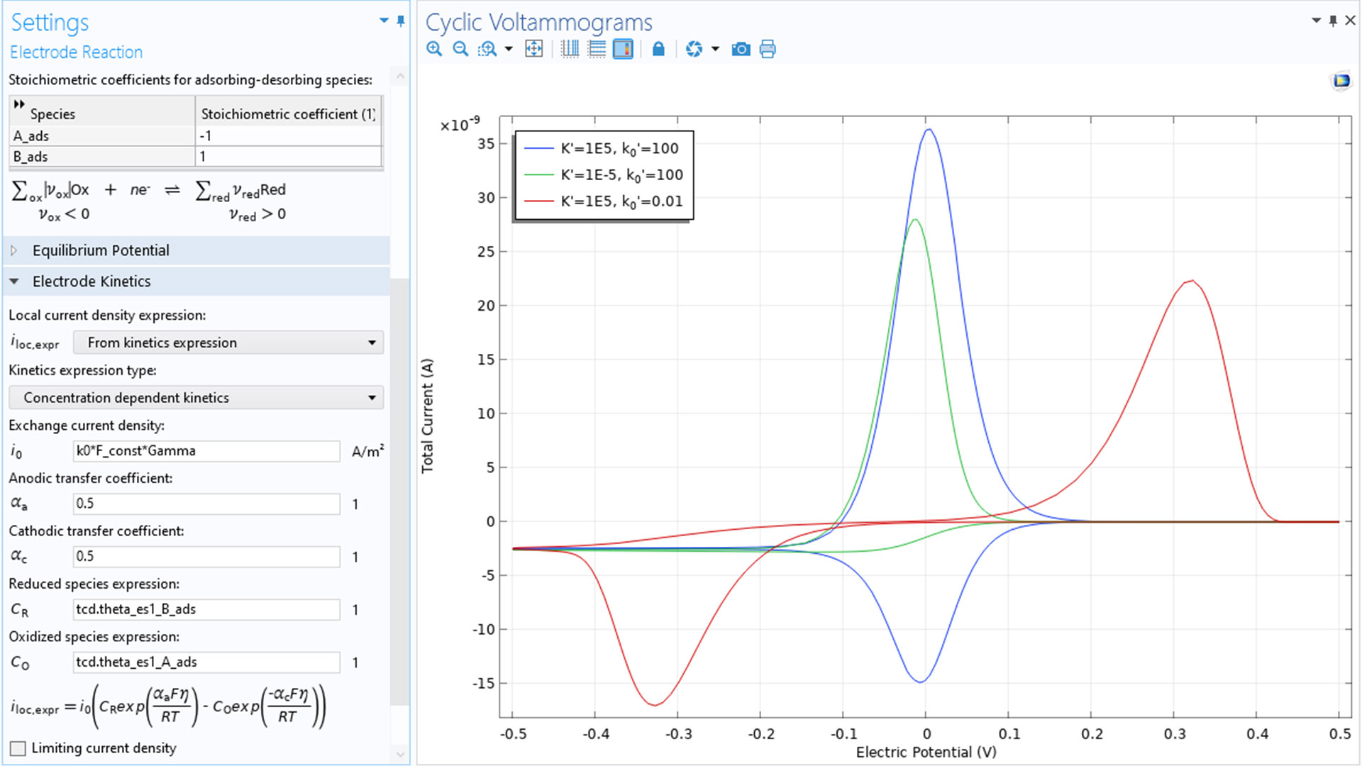 Para que ocurra una reacción electroquímica, la especie que reacciona generalmente necesita adsorberse en la superficie del electrodo antes de someterse a una reducción u oxidación, después de lo cual la especie del producto resultante se desorbe nuevamente en el electrolito. Este ejemplo investiga el impacto de varios parámetros cinéticos para la adsorción, desorción y transferencia de electrones cuando se realiza una voltamperometría cíclica en un electrodo plano.