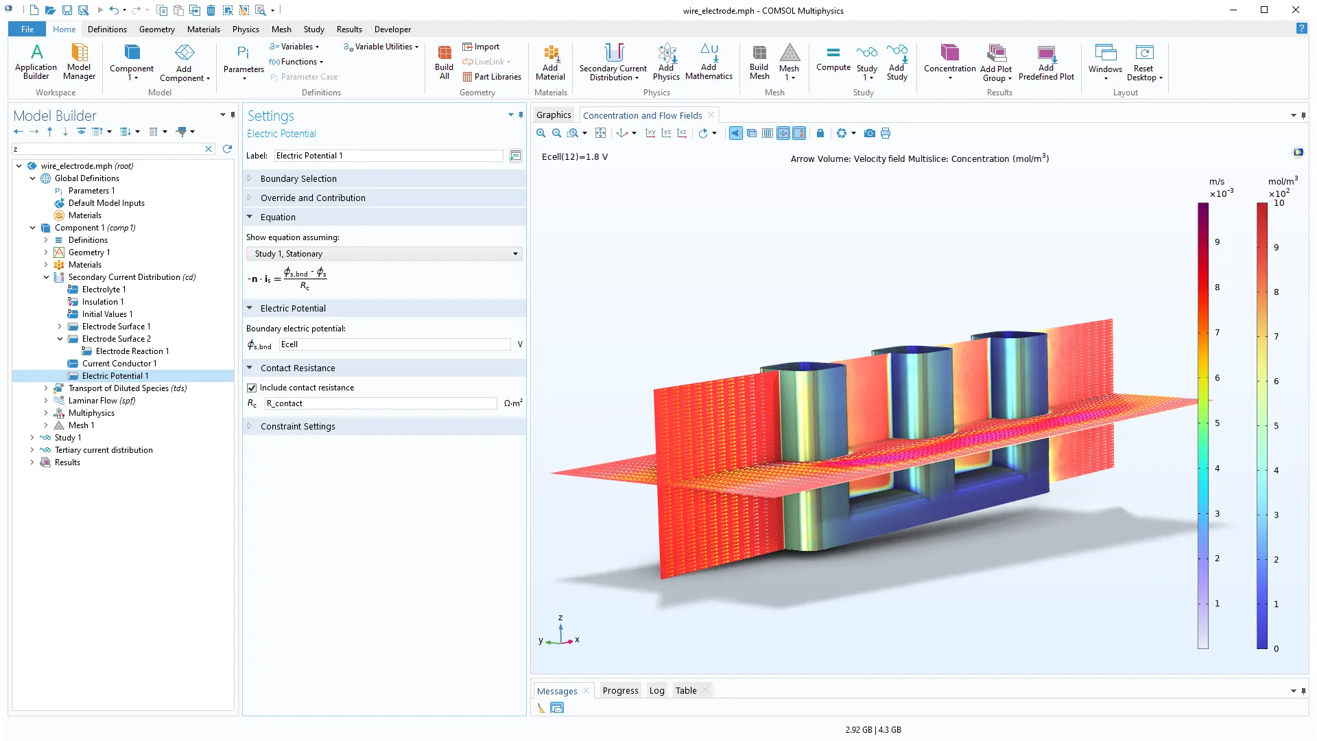 Ejemplo de resistencia de contacto habilitada en el nodo Electrode Potential en el modelo tutorial Wire Electrode.