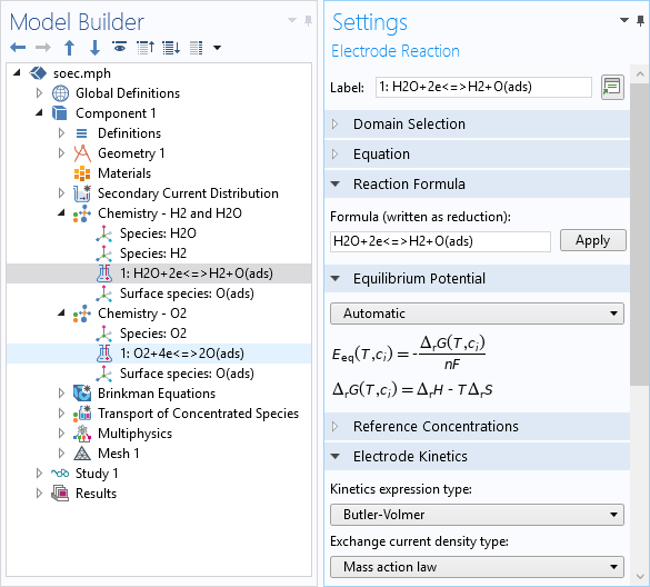 Las reacciones de electrodo ahora soportan un nuevo tipo de cinético de electrodo de Equilibrio termodinámico (conocido como Condición primaria en la interfaz de Distribución de corriente secundaria), que considera un sobrepotencial cero (pérdidas de tensión despreciables).