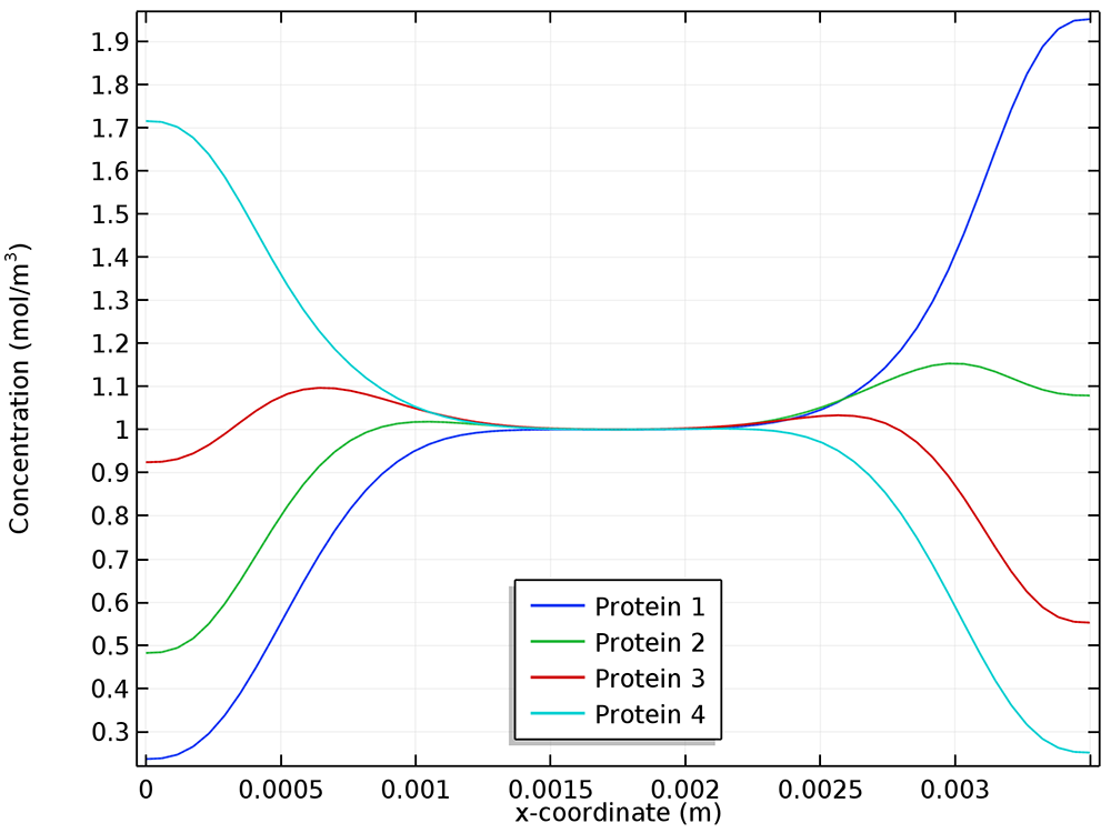 Este ejemplo aplica las interfaces de Transporte electroforético y Flujo laminar para modelar la separación isoeléctrica en un dispositivo de electroforesis de flujo libre. Una corriente conteniendo cuatro proteínas diferentes se separa en corrientes concentradas por medio del transporte migrativo en un campo eléctrico.