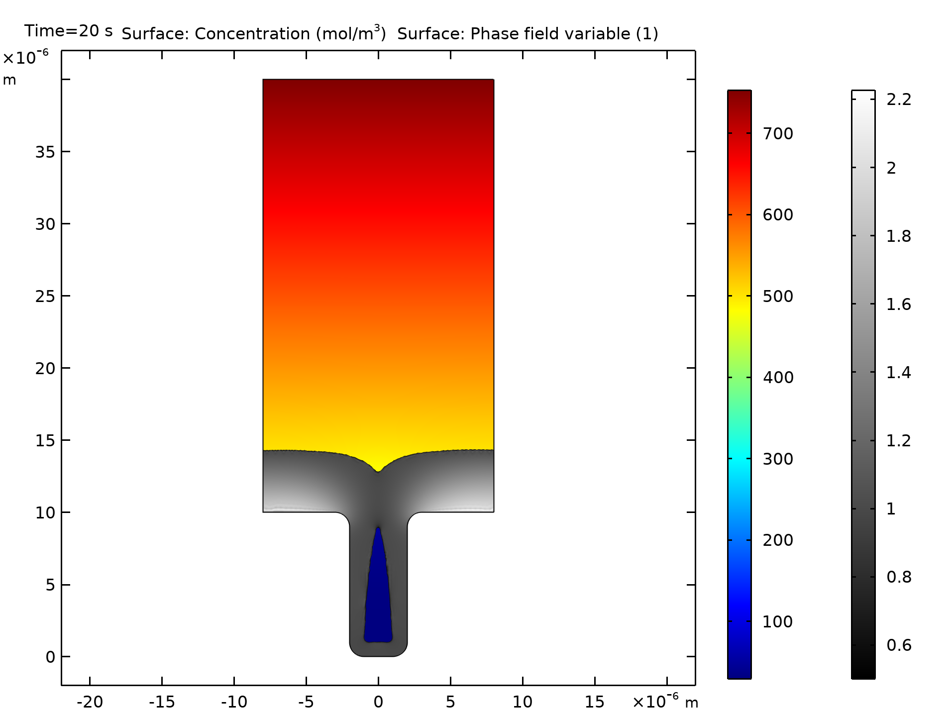 Protuberancia de microconector en 3D: Este nuevo modelo dispone de un acoplamiento de la convección-difusión y electrodeposición con una geometría deformable en 3D.