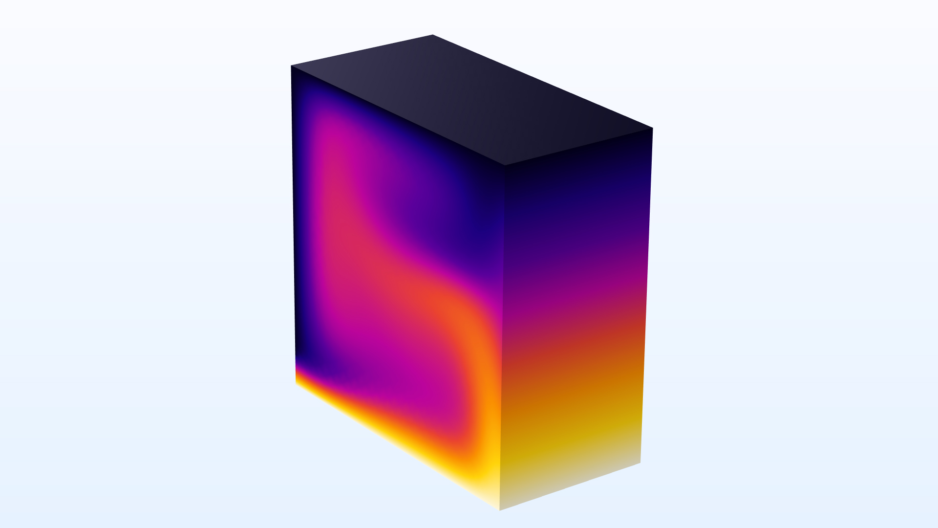 El ejemplo tutorial Free Convection in a Porous Medium hace uso de la nueva funcionalidad de flujo no isotérmico. Temperatura (K) en una estructura porosa sometida a gradientes de temperatura y posterior convección libre.