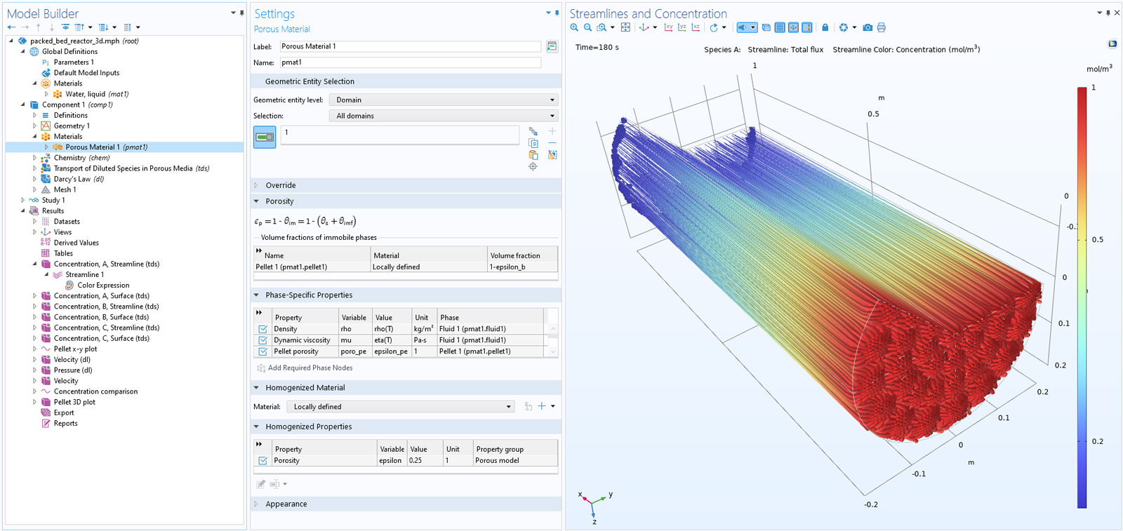 El nuevo nodo Materials para Porous Material ejemplificado en un modelo multiescala de un lecho empacado.
